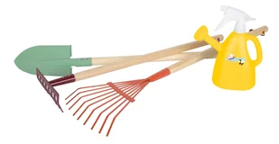 Konewka o pojemności ok. 0,5 l z miarką i wygodnym uchwytem Szpadel - do kopania i przesadzania roślin Grabie do liści - szersze zęby do delikatnego grabienia drobnych odpadków roślinnych Grabki ogrodowe - do wyrównywania podłoża i zbierania liści Cechy produktu: Trwałe materiały: stalowe trzonek i ostrza z lakierowanej, odpornej na korozję stali. Ergonomia: gładkie, naturalne drewno formowane z myślą o wygodzie najmłodszych użytkowników.