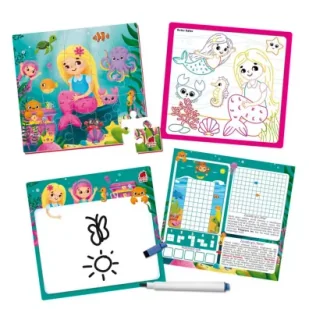 Gra LOGICZNA 4w1 Syrenki Książeczka Puzzle , zabawa i kolory. Intensywne barwy, magiczne ilustracje perfekcyjne dla rozwijającego się dziecka! Zagadki doskonale sprawdzają się dla najmłodszych dzieci, budując logiczne myślenie. 25 elementów do ułożenia. Tablica z pisakiem do ścierania. Baw się i twórz, co tylko chcesz, a gdy skończysz, wywąchaj za pomocą specjalnej gąbki.