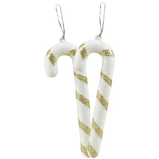 Brokatowa dekoracja świąteczna w kształcie laski cukrowej w kolorze białym ze złotym pasem. Wykonana z tworzywa sztucznego, wyposażona w sznurek umożliwiający jej zawieszenie. W opakowaniu znajdują się 2 sztuki. Produkt o wymiarze 12 cm.