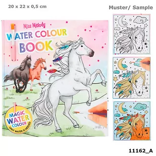 Kolorowanka Miss Melody Water Magic, ok 30 stron do malowania. Do kolorowanki dołączony jest pędzel, mokrym pędzlem trzeba pomalować ciemne linie, by odkryć magię kolorów.