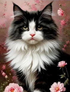 Diamentowa mozaika - Kot czarno-biały w różowych kwiatach