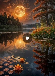 Diamentowa mozaika - Krajobraz pełnia księżyca nad jeziorem z liliami