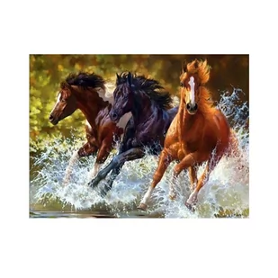 Diamond painting haft diamentowy - konie Diamond painting, zwany inaczej haftem diamencikowym, zyskuje coraz większą popularność. Technika polega na wyklejaniu akrylowymi diamencikami wzoru na tkaninie, w efekcie czego powstaje piękna, efektowna mozaika. Jest to doskonały sposób na relaks, poprawę nastroju, uspokojenie i wyćwiczenie zdolności manualnych. Skład zestawu: wzór na płótnie z naniesionym klejem i powłoką chroniącą przed wysychaniem kleju w rozmiarze 25x35 cm (rozmiar całego płótna 30x40 cm) komplet akrylowych diamencików w rozmiarze 2,5x2,5 mm aplikator (rysik) żelowy klej tacka na kryształki woreczki strunowe na diamenciki instrukcja Instrukcja wykonania: