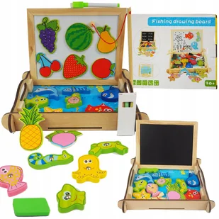 Łowienie rybek to fantastyczna gra, którą dzieci bardzo lubią. Pudełko, w którym łowimy rybki, to jeziorko, które trzeba samemu złożyć. 12 różnorodnych zwierzątek morskich można łowić na wędkę z magnesem. Zestaw posiada dwustronną tablicę, która z jednej strony jest kredowa a z drugiej magnetyczna. Dołączono do niej różne owoce, które przyczepia się za pomocą magnesu, dzięki czemu dziecko nie tylko może uczyć się ich nazw ale również może nauczyć się je pisać.