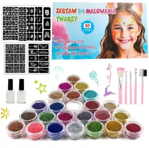 Farby Do Malowania Twarzy Tatuaze Zmywalne Dla Dzieci Szablony Zestaw XXXL ❤️IDEALNY NA PREZENT❤️ Ładne polskie opakowanie Zestaw do malowania twarzy dla dzieci - Ten zestaw do makijażu dla dzieci zawiera: 6 farb i 24 brokaty do posypywania tatuaży Nadaje się na wiele okazj. Ten zestaw do makijażu dla dzieci jest idealny na Halloween, Boże Narodzenie, Wielkanoc, urodziny, imprezę, karnawał, makijaż dla dzieci, idealny dla początkujących lub profesjonalistów, zorganizuj swoje dzieci, rodzinę i przyjaciół, aby stworzyć swój własny makijaż karnawałowy Bezpieczny i przyjazny dla skóry - nasz zestaw do makijażu dla dzieci jest nietoksyczny, hipoalergiczny i niekonserwujący, odpowiedni dla chłopców i dziewcząt oraz dorosłych, makijaż dziecięcy na bazie wody jest łatwy do czyszczenia (ponieważ każda skóra jest inna, należy przetestować go na skórze za uchem przed nałożeniem na twarz) ✅Cechy produktu: Wielokolorowa zabawa: Bezpieczeństwo użytkowania: