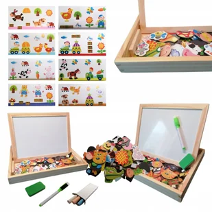 DREWNIANA TABLICA MAGNETYCZNA Z UKŁADANKĄ "FARMA". TABLICA DWUSTRONNA Z WESOŁYMI MAGNESAMI. Tablica magnetyczna to produkt skierowany dla dzieci lubiących kreatywnie spędzać czas. Zabawka ma podwójne zastosowanie. Z białej strony możemy malować suchościeralnymi mazakami oraz układać magnetyczne puzzle, natomiast po stronie czarnej możemy rysować kredą.