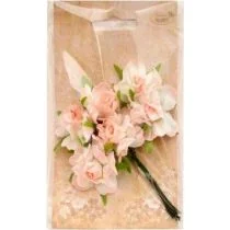 Ładne, kwiatki materiałowe, skręcone w jedną wiązkę. Można je rozłączyć i używać pojedynczo do zdobień lub użyć jako całą wiązkę.