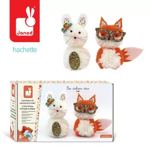 Janod Zestaw 2 pomponów zwierząt do stworzenia - The Warsztaty Deco Kit kreatywny wypoczynek Dziecięcy zdolności motoryczne i koncentracja-od 8 lat, J07919, pomarańczowy/biały J07919