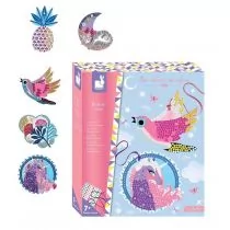 Zestaw kreatywny Cudowne kryształki Medaliony francuskiej marki JANOD zawiera 5 medalionów-naklejek o różnych kształtach, przedstawiających: egzotycznego ptaka, jednorożca, róże, ananasa i śpiącego kotka na księżycu.