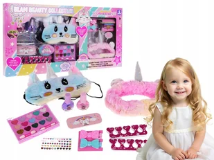 - opaska na włosy z motywem jednorożca, - opaska na oczy z motywem jednorożca, - 2 separatory do paznokci - 2 lakiery do paznokci, - paleta 15 cieni, - 2 pędzelki dwustronne do cieni, - 4 x gumki do włosów, - sprężynka do włosów, - 2 x spinki do włosów, - pilniczek do paznokci, - naklejki na paznokcie |