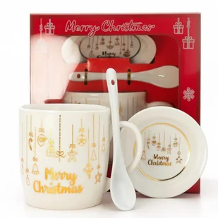KUBEK CERAMICZNY z motywem świątecznym Zestaw z pokrywką i łyżeczką Idealny gadżet dla każdego miłośnika kawy czy herbaty. Specyfikacja: Materiał: ceramika / stal nierdzewna Kolor: biały, złoty Pojemność: max 350 ml Wymiary: