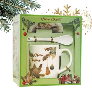 KUBEK CERAMICZNY z motywem świątecznym Zestaw z pokrywką i łyżeczką Idealny gadżet dla każdego miłośnika kawy czy herbaty. Specyfikacja: Materiał: ceramika / stal nierdzewna Kolor: Zielony Pojemność: max 440 ml Wymiary: