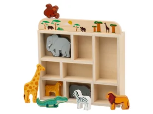 Las: 1x daszek z motywem, 1x drewniane pudełko, 1x jeż, 1x wiewiórka; 1x lis, 1x borsuk, 1x niedźwiedź, 1x jeleń, 1x zając, 1x sowa Safari: 1x daszek z motywem, 1x drewniane pudełko, 1x krokodyl, 1x nosorożec, 1x zebra, 1x małpa, 1x żyrafa, 1x lampart, 1x słoń, 1x lew Ocean: 1x daszek z motywem, 1x drewniane pudełko, 1x delfin, 1x pingwin, 1x ośmiornica, 1x mewa, 1x krab, 1x wieloryb, 1x rekin, 1x ryba, 1x lew morski Farma: 1x daszek z motywem, 1x drewniane pudełko, 1x kot, 1x świnia, 1x kogut, 1x kaczki, 1x pies, 1x koń, 1x krowa, 1x owca, 1x osioł Ostrzeżenie: Uwaga: Używać pod bezpośrednim nadzorem osoby dorosłej.