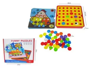 Mozaika zawiera plastikowe pinezki (46szt) w różnych kolorach i większym rozmiarze, co ułatwi chwytanie ich w małe rączki. Maluchy mają za zadanie odpowiednio dopasować kołeczki do otworów znajdujących się na obrazkach. W zestawie znajduje się 12 ilustracji przedstawiających m. in. kurczak, biedronka, dinozaur, bucik. Mix produktu(sprzedawany oddzielnie).