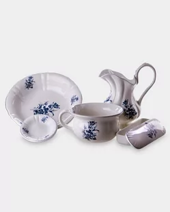W skład zestawu wchodzi: *dzban na wodę *misa *talerzyk np. na mydło *pudełko na przybory toaletowe z pokrywą *nocnik