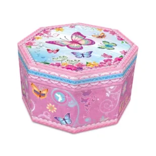 Pozytywka ośmiokątna - Motylki Pozytywka gra klasyczną melodię. Po otwarciu figurka będzie się kręcić. Gdy melodia przestanie grać pozytywkę wystarczy nakręcić. Działa dzięki specjalnemu mechanizmowi, nie wymaga baterii. Zawiera lusterko oraz miejsce na schowanie drobiazgów.