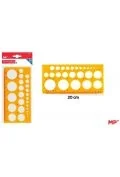 Plastikowy szablon do napisów z okręgami w różnychrozmiarach. Zawiera linijkę 20 cm.