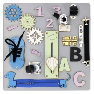 Tablica naturalna Wyposażenie tablicy: różnokolorowe, ruchome kółka zębate zamek błyskawiczny dzwonek rowerowy dwa rodzaje zasuwek but ze sznurówką (nauka sznurowania) cyferki drewniane różnokolorowe literki drewniane ruchome i obrotowe kółka do mebli rzep ścieżka z ruchomym pieskiem Zawiera samoprzylepny filc, zapobiegający rysowaniu podłoża
