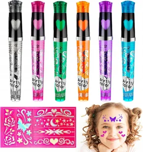 6 pisaków 1x listek 6 szablonów Zapakowane w blister ✔️Przygotowanie skóry – upewnij się, że skóra jest sucha i czysta przed aplikacją tatuażu. ✔️Nałożenie szablonu – wybierz odpowiedni wzór, nałóż szablon na skórę i delikatnie przyciśnij. ✔️Aplikacja żelu – nanieś warstwę żelu długopisem na obszar w środku szablonu. ✔️Usunięcie szablonu – po zakończeniu aplikacji ostrożnie zdejmij szablon i ciesz się brokatowym tatuażem. Tatuaż można zmyć mydłem lub oliwką dla dzieci.