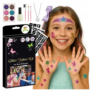 Zestaw zawiera: � 3 arkusze na których znajdziemy szablony do tatuaży brokatowych. ?? 1 buteleczka kleju do tatuaży, ?? pędzelki do nakładania brokatów ?? 6 słoiczków kolorowych brokatów(zielony, niebieski, różowy, pomarańczowy, fioletowy, złoty) ?? Naszyjnik Instrukcja aplikacji tatuaży brokatowych: Szablon należy przykleić w odpowiednim miejscu, Powierzchnie pokryć klejem mocującym, Za pomocą aplikatora nakładamy brokat, Czekamy aż wyschnie, Usunąć szablon, Gotowe ! Najważniejsze Zalety: ✔️ łatwa aplikacja ✔️ długa trwałość ✔️ łatwo zmywalne ✔️ wiele różnych wzorów ✔️ wysoka jakość ✔️ bezpieczeństwo korzystania