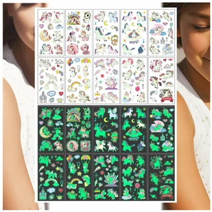 TATUAŻE ZMYWALNE ŚWIECĄCE W CIEMNOŚCI BAJKA JEDNOROŻEC 10 WZORÓW ⭐⭐⭐⭐⭐ Zestaw tatuaży zmywalnych dla dziewczynki i chłopca. W komplecie znajduje się aż 10 różnych, wesołych motywów, które łatwo nakleić i bezpiecznie zmyć. Idealna zabawa na co dzień, urodziny czy przyjęcia dla dzieci.