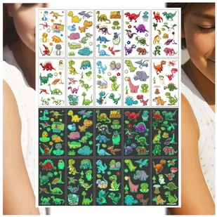 TATUAŻE ZMYWALNE ŚWIECĄCE W CIEMNOŚCI DINOZAURY Z BAJEK 10 WZORÓW ⭐⭐⭐⭐⭐ Zestaw tatuaży zmywalnych dla dziewczynki i chłopca. W komplecie znajduje się aż 10 różnych, wesołych motywów, które łatwo nakleić i bezpiecznie zmyć. Idealna zabawa na co dzień, urodziny czy przyjęcia dla dzieci.