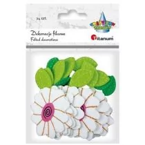 Przedstawiamy oryginalne treściwe naklejki 3D wykonane z filcu. W zestawie znajdują się urocze naklejki w kształcie kwiatków o wymiarach 58 x 45 mm. Dodatkowo, w skład zestawu wchodzą jasnozielone listki o rozmiarach 18 x 30 mm oraz zielone listki o wymiarach 14 x 24 mm. W sumie, zestaw zawiera 24 sztuki tych atrakcyjnych naklejek.