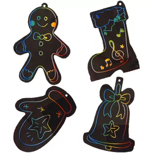 ZAWIESZKI ŚWIĄTECZNE Szukasz wyjątkowego prezentu świątecznego dla swoich bliskich? Skorzystaj z naszej propozycji i zaskocz ich wyjątkowymi wydrapywankami! Nasze wydrapywanki to nie tylko oryginalny pomysł na prezent, ale również świetna zabawa dla całej rodziny. Każda zawieszka prezentuje tradycyjny świąteczny symbol - piernika, dzwonek, but oraz rękawiczkę - i oferuje nie tylko urokliwą dekorację, ale także kreatywną zabawę. Wysokość zawieszki to około 11 cm, co sprawia, że jest idealna do dekoracji choinki czy też innych części domu. Zawieszki wyposażone są w kolorowe tło pokryte czarną farbą, którą możesz zdrapywać, używając ołówka, patyczka lub innego narzędzia, tworząc w ten sposób własne, unikalne wzory. W zestawie znajdziesz 4 zawieszki, każda z srebrną nitką, gotową do zawieszenia.