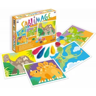 16 małych pojemników z kolorowym piaskiem, 4 szablony obrazkowe "Dinozaury" (25 x 18 cm).