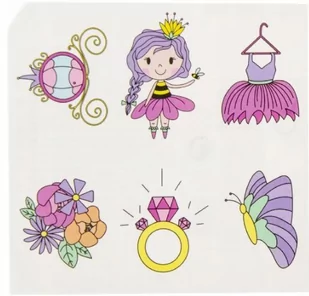 Zestaw tatuaży 6 sztuk - Księżniczka Nasz zestaw składa się z 6 różnych wzorów, które z pewnością zachwycą każdego. Tatuaże są wykonane z bezpiecznych i niet...