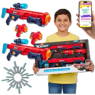 X-SHOT EXCEL Ilość elementów: 28 (4 wyrzutnie + 24 strzałki) W zestawie: 2x Hawk Eye (z doczepianą lunetą) 2x Micro Blaster 24x piankowe strzałki Zasięg: do 27 metrów Materiał: Tworzywo sztuczne / pianka Wiek: