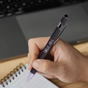 Metalowy długopis z gumką TOUCH PEN do pisania po tablecie, smartfonie, który w dolnej części ma wygrawerowane imię lub napis. Długopis ma aluminiowy korpus ...