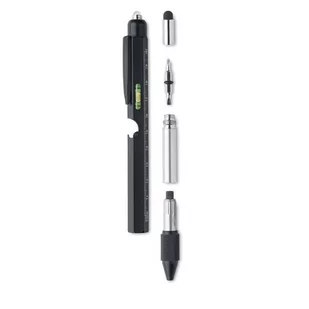 Długopis ze stali nierdzewnej z poziomicą, linijką, rysikiem i końcówką śrubokrętu krzyżakowego i płaskiego oraz z diodą LED. 3 baterie AG w zestawie. Niebie...
