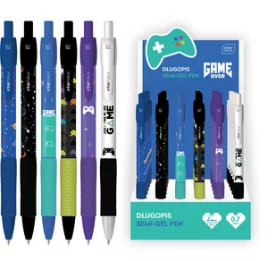 Niebieski wkład. Wygodny gumowy uchwyt. Grubość linii pisania: 0.7 mm. Dostępny w 6 ciekawych, chłopięcych wzorach. Mix wzorów, wysyłka losowa. Cena za sztukę.
