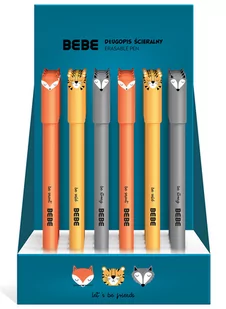 Długopis ścieralny zamykany na skuwkę z uszkami zwierzaków. Zakończony gumką. Ściera nie pozostawiając śladów. Niebieski wkład. Długopis dostępny jest w 3 wzorach ze zwierzakami z kolekcji BB Friends. 36 szt. w displayu.
