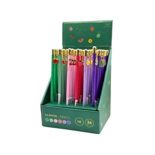 Cechy: twardość HB, grafit o wysokiej jakości, okrągły przekrój, dzięki czemu ołówek jest poręczny łatwy do temperowania, solidna oprawa, zawieszka w kształcie różnych owoców, zawieszka doczepiona za pomocą karabińczyka( można ją zdjąć i przymocować jako ozdoba np. na piórniku czy portfeliku) w opakowaniu zbiorczym 36sztuk, wymiary opakowania: 14,3x14,5x19,5cm.