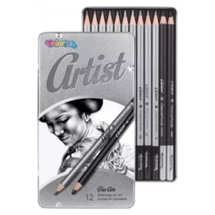 Zestaw do rysowania Artist 12 szt. Wysokiej jakości ołówki grafitowe i węgiel o wytrzymałych grafitach, przeznaczone do wykonywania szkiców, projektów, rysunków architektonicznych. Zestaw zawiera ołówki grafitowe w 10 stopniach twardości oraz węgiel w 2 stopniachEleganckie, metalowe opakowanie