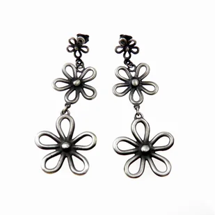 Wyraziste kolczyki srebrne z trzema kwiatuszkami. Wykończone oksydą w kolorze grafitowym. Długość całkowita kolczyków 6,2 cm Szerokość kwiatuszków: 1 cm, 1,9...