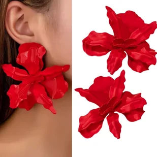 CZERWONE żywe kolczyki kwiaty duże mat METALOWE efektowna biżuteria wesele