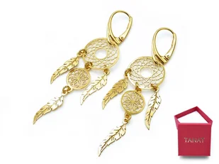 Długie, pozłacane kolczyki w stylu boho łapacz złych snów wykonany z dwóch połączonych ze sobą rozet zdobionych piórami. Zapakowane w firmowe pudełka (wzór p...