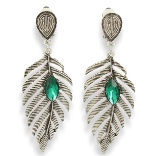 Klipsy do uszu wiszące liscie z zielonym kamieniem srebrne