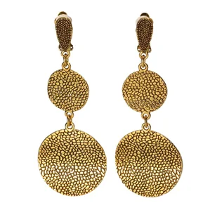 Klipsy do uszu złote wiszące – okrągłe, fakturowane, eleganckie Klipsy do uszu Złote Wiszące- Okrągłe, fakturowane, eleganckie Charakterystyka klipsów do uszu sprzedawanych w naszym sklepie: Materiał: Tworzywo sztuczne, metal nieszlachetny Wymiary: wysokość około 7,5 cm, szerokość około 3 cm. Zapięcie / mocowanie: Klips Kolor:
