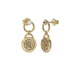 Kolczyki Guess Dreaming JUBE03130JWYGT/U są wykonane z platerowanej stali nierdzewnej o kolorze złotym. Ich charakterystyczną cechą jest zawieszka w kształcie monety z logo 4G marki Guess, która jest umieszczona na aplikacji z sześciennych cyrkonii, co dodaje kolczykom blasku i elegancji. Na tylnej stronie zawieszki znajduje się grawerowane logo marki Guess, co stanowi subtelny element dekoracyjny, ale jednocześnie świadczy o jakości produktu. Kolczyki posiadają zapięcia na sztyfty, które są praktyczne i łatwe w użyciu. Długość całkowita to 2,5 cm.