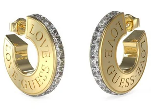 Kolczyki ze stali chirurgicznej pozłacane z napisem GUESS i cyrkoniami na sztyft. Szeroki przekrój, dmuchane kółka. Platerowanie w odcieniu żółtego złota Kolor: żółte złoto Materiał: stal chirurgiczna/nierdzewna Wymiary: