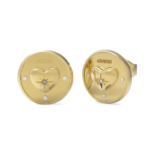 Kolczyki Guess Talismania JUBE01446JWYGT/U to elegancki dodatek, który przypadnie do gustu każdej kobiecie. Wykonane ze stali chirurgicznej i w kolorze złotym, prezentują się bardzo stylowo i modnie. Kolczyki są wkładane na sztyfty, a ich ozdobą są okrągłe blaszki, w których środku znajduje się urocze serduszko 3D. Dodatkowo, blaszki są ozdobione kilkoma kryształkami, które dodają im blasku i elegancji. Na każdej z blaszek znajduje się również subtelne logo firmy Guess, co dodaje im oryginalności.