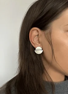 Okrągłe kolczyki wykonane w całości ręcznie ze srebra pr. 925. Powierzchnia srebra jest zmatowiona, co sprawia, że kolczyki mają ciekawą fakturę i ładnie odbijają światło. kolczyk składa się z dwóch elementów połąc ...