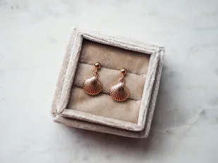 Kolczyki muszelki na sztyftach Metal: srebro 925 pokryte 18k różowe złotem Wymiary muszelki: 1,20 cm x 1,40 cm Długość kolczyków: 2 cm Biżuteria pakowana jest w firmowe pudełeczko z logo Misarte. ...