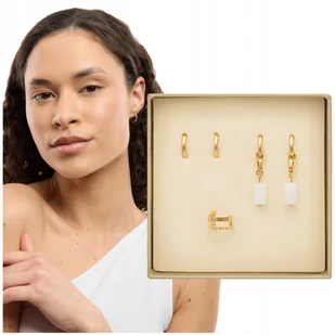 Kolczyki pozłacane z kamieniami naturalnymi biały jadeit zestaw 5 kolczyków Mys Zestaw kolczyków MYS z białym jadeitem to kwintesencja ponadczasowej elegancji. Subtelne kolczyki z naturalnym kamieniem, klasyczne kółeczka i modna nausznica tworzą zestaw, który możesz dopasować do każdej stylizacji – od codziennej, po wyjątkowe okazje. To biżuteria, która nie dominuje, lecz pięknie dopełnia. Każdy element zestawu możesz nosić razem lub osobno, tworząc swój własny styl w oparciu o eleganckie detale. Całość zamknięta jest w estetycznym pudełku.