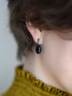 Eleganckie kolczyki wykonane ręcznie ze srebra z owalnymi onyksami. Całość wykończona oksydą w kolorze grafitowym. Całkowita długość kolczyków 2,3 cm. Wymiar...