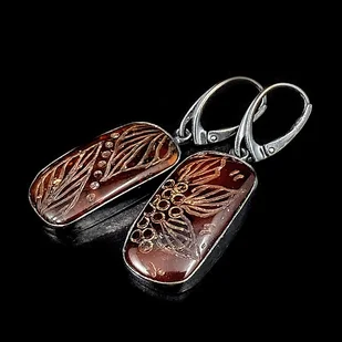 Romantyczne kolczyki z oprawionymi w oksydowane srebro pr.925 bursztynam w pięknej formie. Na tafli kamieni wyrzeźbione zostały kwiaty. Oprawa ma wymiary 30 x 15 mm. Długość kolczyków z biglami 50 mm. Wa ...